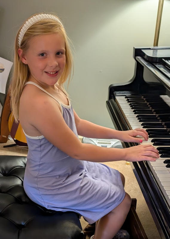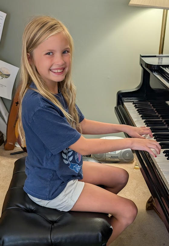 Layla likes playing duets and learning new pieces. She enjoys singing, gymnastics, exploring outside, and making movies with friends. She likes the music of Taylor Swift.