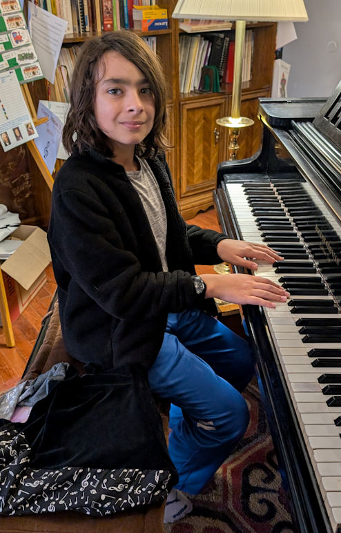 Theo is a new beginner who likes to play by ear and experiment with sounds and making up pieces. He likes to play outdoors and listen to his dad play guitar. His favorite composer is Bach.